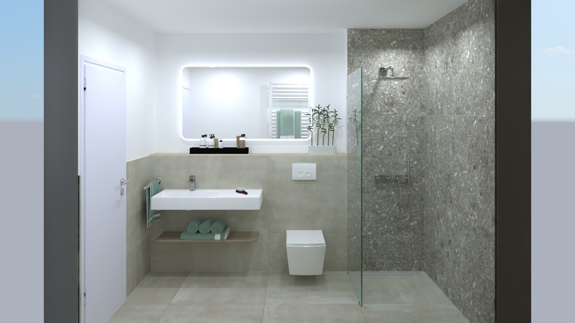 - Modernes Bad: Das Badezimmer vereint Funktionalität und Luxus mit hochwertiger Sanitärkeramik. Es verfügt über eine ebenerdige Dusche, Waschtischunterschrank, beleuchtetem Spiegel, Handtuchheizkörper und Badradio.
