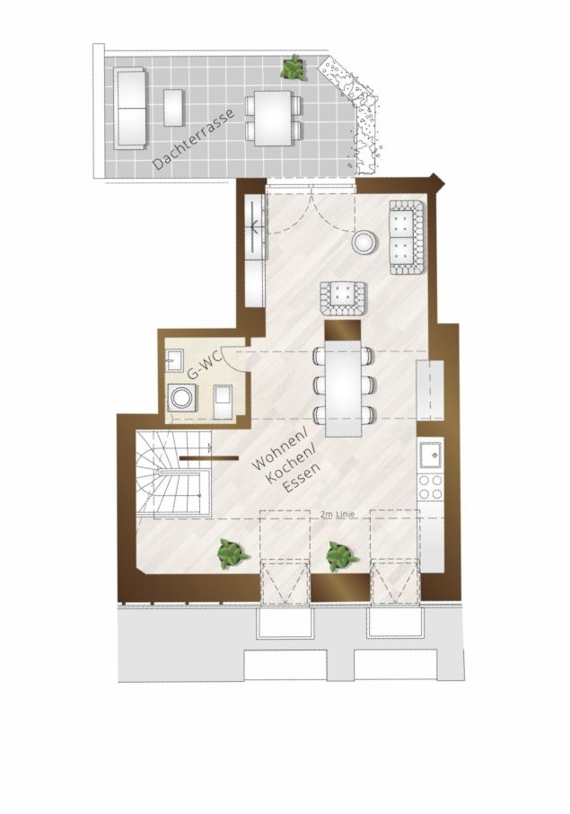 - Dachterrasse mit hofseitiger Ausrichtung: Genießen Sie die Vorzüge einer privaten Außenfläche, die idealen Raum zum Entspannen bietet.