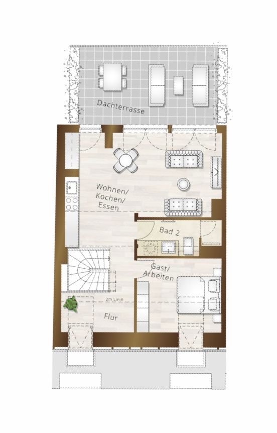 - Dachterrasse mit hofseitiger Ausrichtung: Genießen Sie die Vorzüge einer privaten Außenfläche, die idealen Raum zum Entspannen bietet.